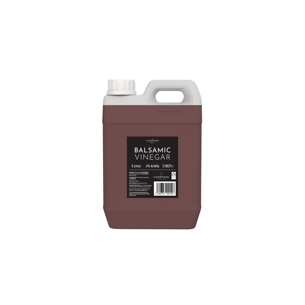 A rich, flavourful, sweet and smokey balsamic vinegar, supplied in a large five-litre plastic bottle; perfect for use in professional kitchens. Matured in oak and chestnut casks before bottling, this Caterfood Select Balsamic Vinegar is a blended wine vinegar from selected Italian wine cellars. Great for using in sauces, marinades and salad dressings.