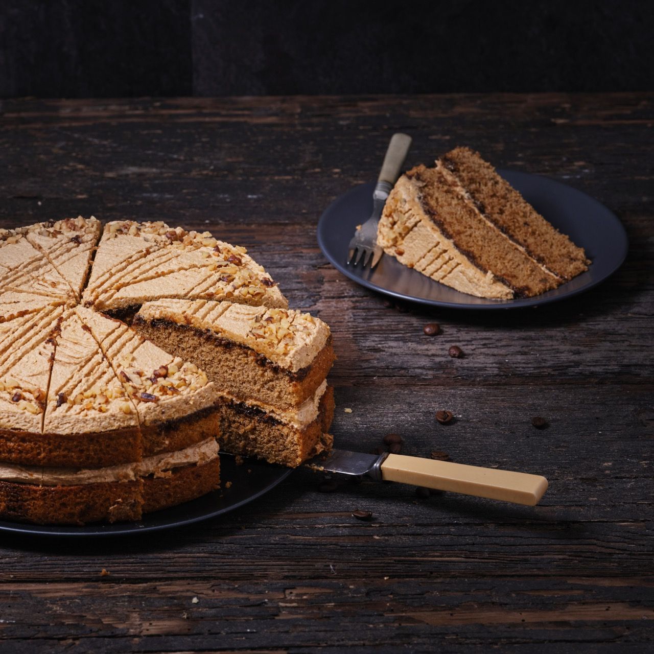 A magnificent version of this classic cake, this handmade coffee sponge is soft and sumptuous, with crunchy walnut pieces running through it. For extra coffee flavour, once it is out of the oven the Caterfood Select Coffee and Walnut Cake is drizzled with a divine coffee syrup, then filled and topped with a rich, thick coffee buttercream and traditionally decorated with walnut pieces. Each cake is pre-cut into 14 slices and frozen, with each slice weighing approx. 160g. Simply defrost and serve.